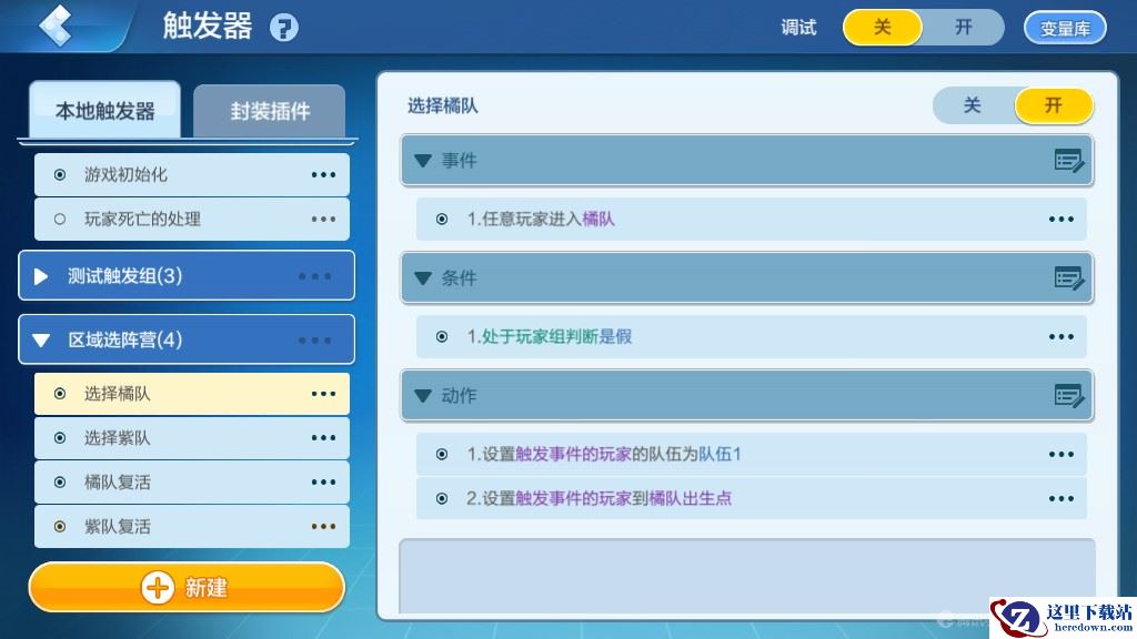 那么好的,我们现在看到“选择阵营”触发器里面的内容,由于【橘队】和【紫队】的选择/复制 都是一样的,所以我这里就只讲一个,剩下的一个大家自己动手吧