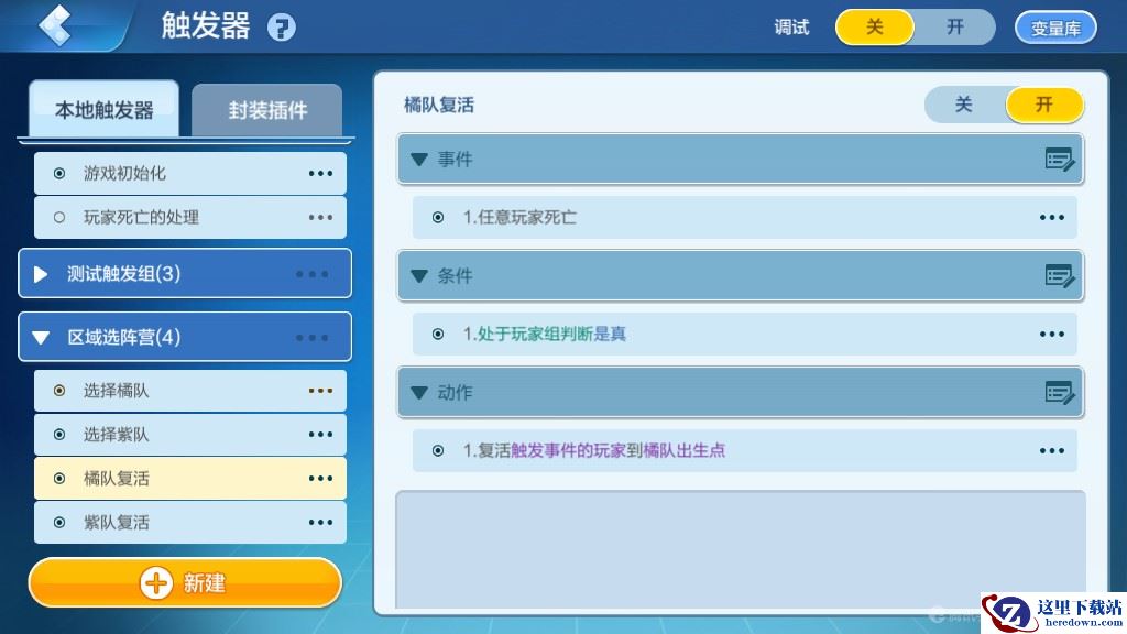 添加动作:玩家->复活,复活“触发事件的玩家”到“选择->橘队复活点”