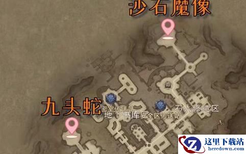 3、然后找到九头蛇的位置,如下图所示,该地区有两个boss,一个是九头蛇,一个是沙石魔像。玩家想要遇见九头蛇还是需要看运气的,如果第一次灭有遇到,可以多收集残页,多开几次书。