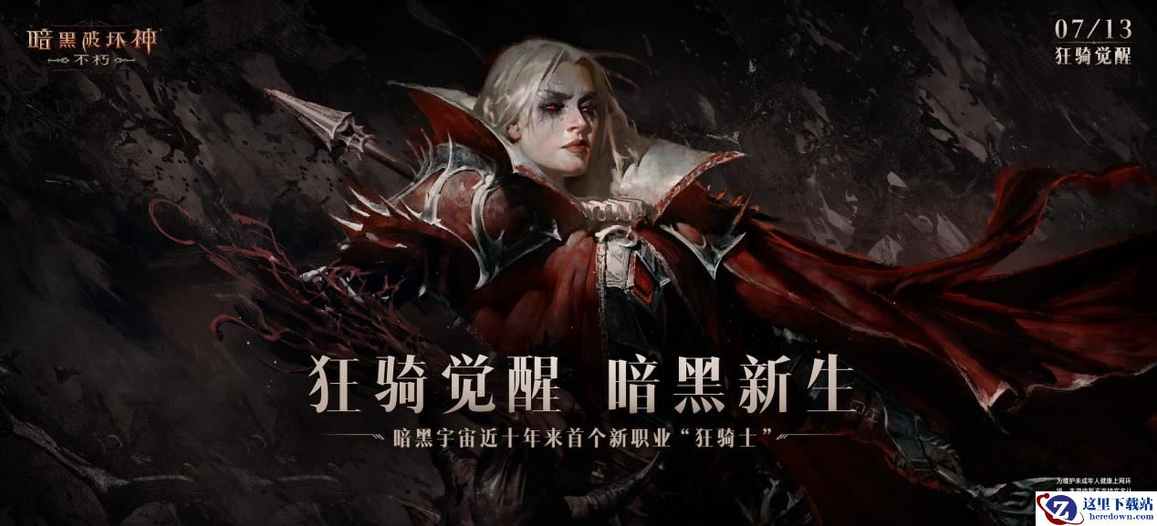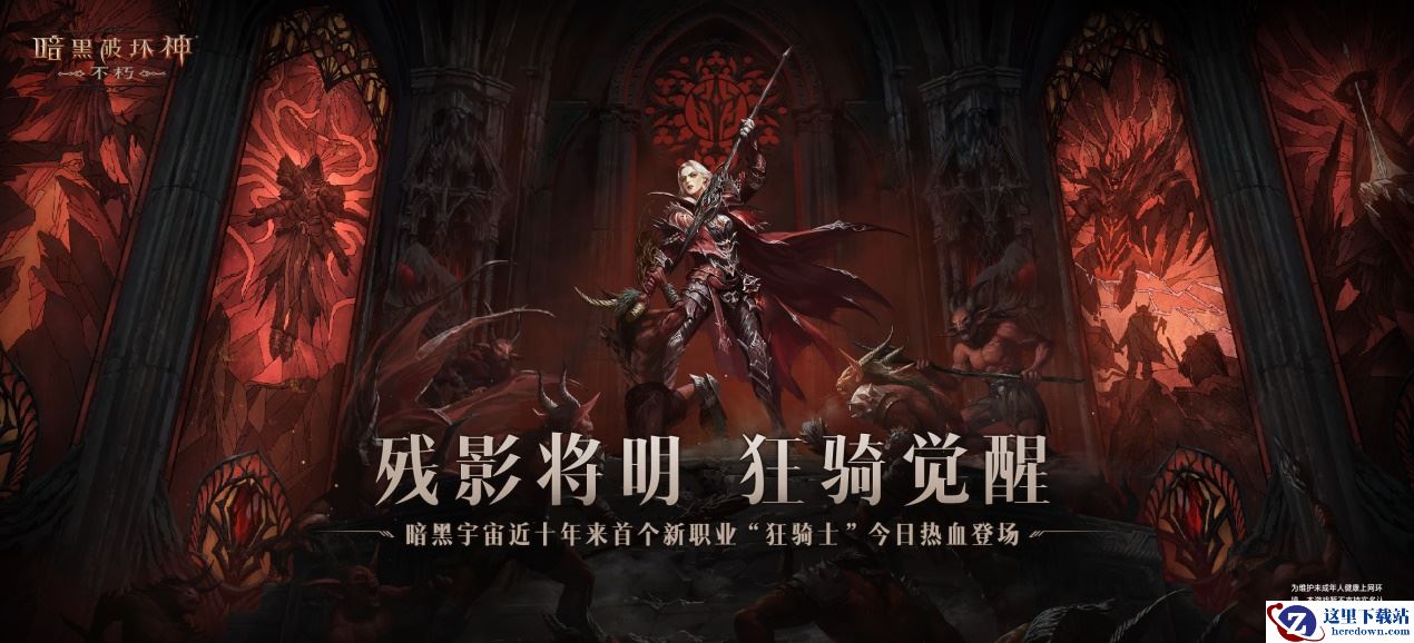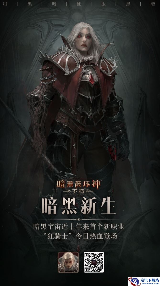 用黑暗征服黑暗——暗黑宇宙近十年来首个新职业“狂骑士”现已热血登场!狂骑觉醒,暗黑新生,由网易和暴雪娱乐联合开发的旗舰大作《暗黑破坏神:不朽》首个年度资料片“毁灭新生”第三幕奏响今夏最强音!变身狂魔,战场狂飙,半人半魔双面骑士浴血新生。物魔双修,全能控场,攻守兼备狂暴觉醒一爽到底。“黑暗臣服于我”,狂骑士同名新服热血开启,狂一夏就很爽!