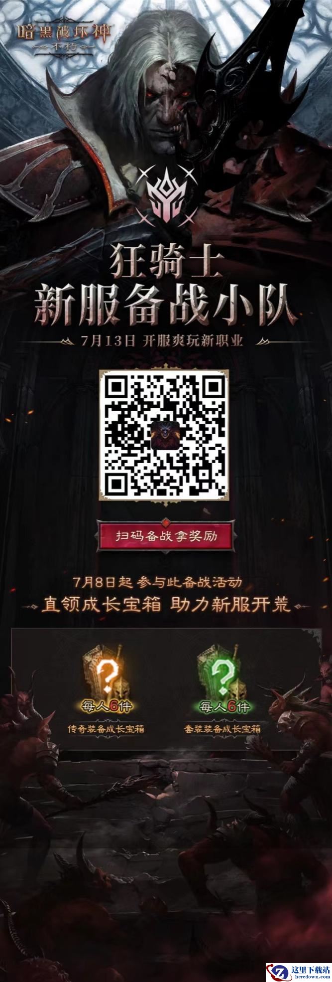 扫描下方图片中的二维码参与活动,即可组建或加入新服备战小队,简单动动手指完成小队人数目标,即可轻易解锁包含传奇装备与套装装备的成长宝箱福利。最高可领取6件橙装加6件绿装,助力新服开荒!