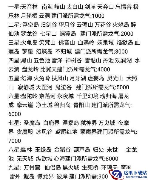 浮空岛、归剑谷、望月谷、云荡山、万花谷、火烧岛、醉仙池、梦龙谷、七星山、蝶翼岛。建门派所需龙气:2000