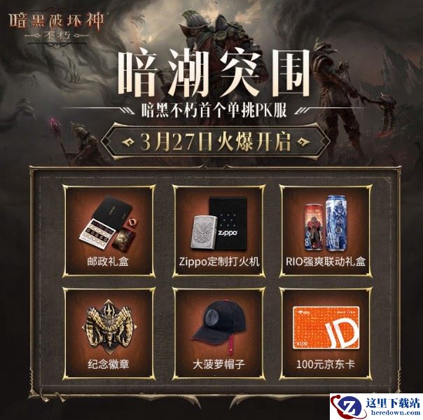 新服PK,不服来战!《暗黑破坏神:不朽》首个单挑PK服【暗潮突围】将于3月27日火爆开服,邮政礼盒、Zippo定制打火机、RIO强爽联动礼盒、纪念徽章、大菠萝帽子、角色典藏卡等惊喜好礼预约即可抽取!新服正式上线后,前往【暗潮突围】服务器创建角色,并完成梯度任务的玩家,还能获得更多抽奖机会赢取丰厚奖励,让你在新服战个痛快!