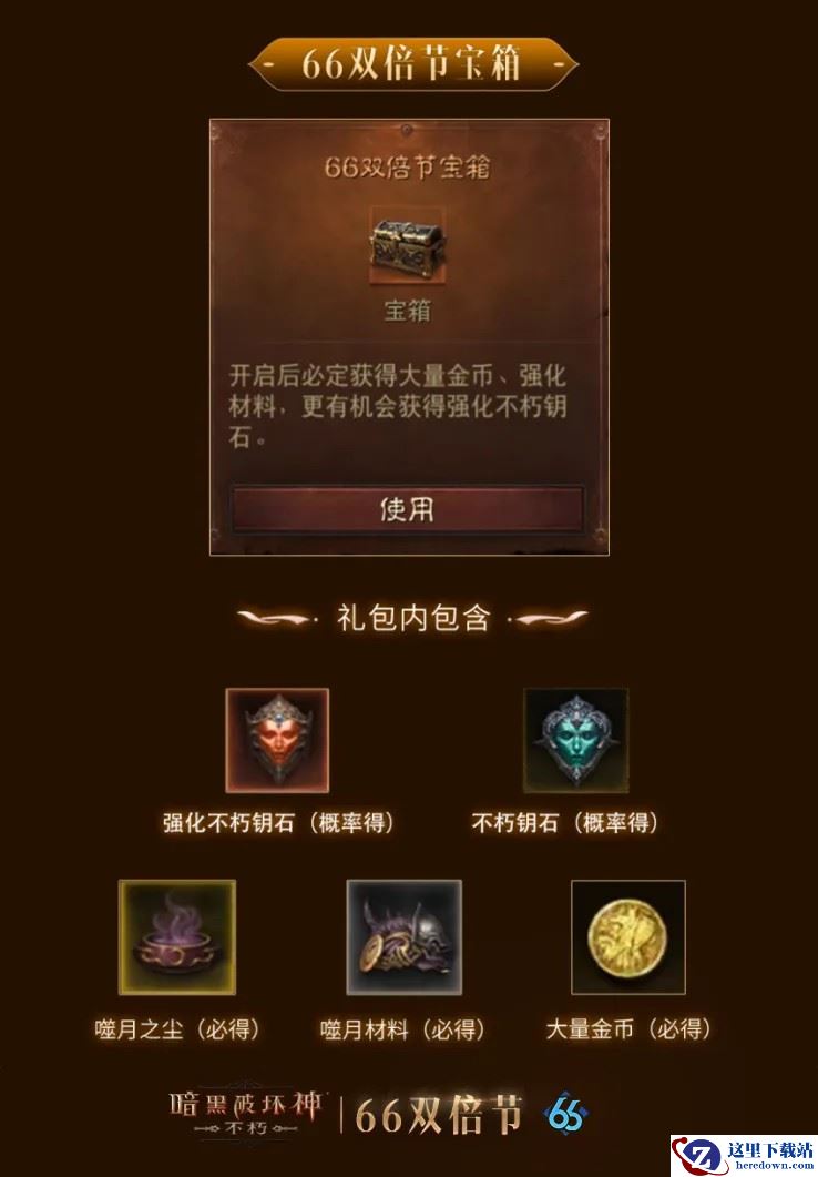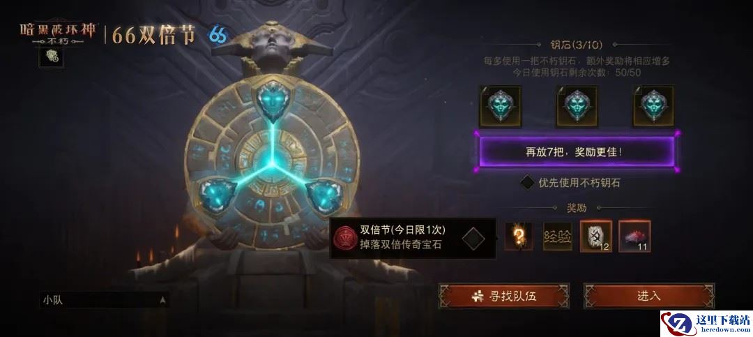 传奇宝石双倍,惊喜依旧延续。在本次双倍节期间,不朽秘境传奇宝石双倍掉落依旧生效!3月6日3:00至3月7日2:59,玩家前往不朽秘境,即可拥有一次选择传奇宝石双倍掉落的机会,若在选择之后通关不朽秘境,就能额外获得种类相同、星级随机的绑定传奇宝石。双倍掉落时间有限,错过再等一个月,快快拿好手中的钥石,用一次通关换双份惊喜!