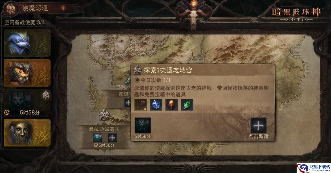 全新玩法,打开新局面!在新版本【决战迪亚波罗】中,庇护之地还迎来了全新玩法“使魔派遣”。现在玩家可以通过妮萨派遣备战使魔,帮助完成赫拉迪姆遗志地宫探索、暗影会密谋行动、灾厄之塔贡献点获取,派遣结束后即可轻松收获奖励。