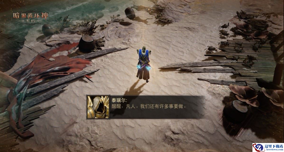 黑暗笼罩,远征航船遇袭触礁沉没。刚刚到达极域之冠附近的海域,人类联军便遇到狂信徒的袭击,最终导致船只触礁,幸好泰瑞尔及时唤醒昏迷的玩家。碧波荡漾,海藻和海洋生物遍布,玩家寻遍极域之冠的海滩,最终发现了幸存的不朽者指挥官尼米斯,并在其指引下,前往人类联军营地。