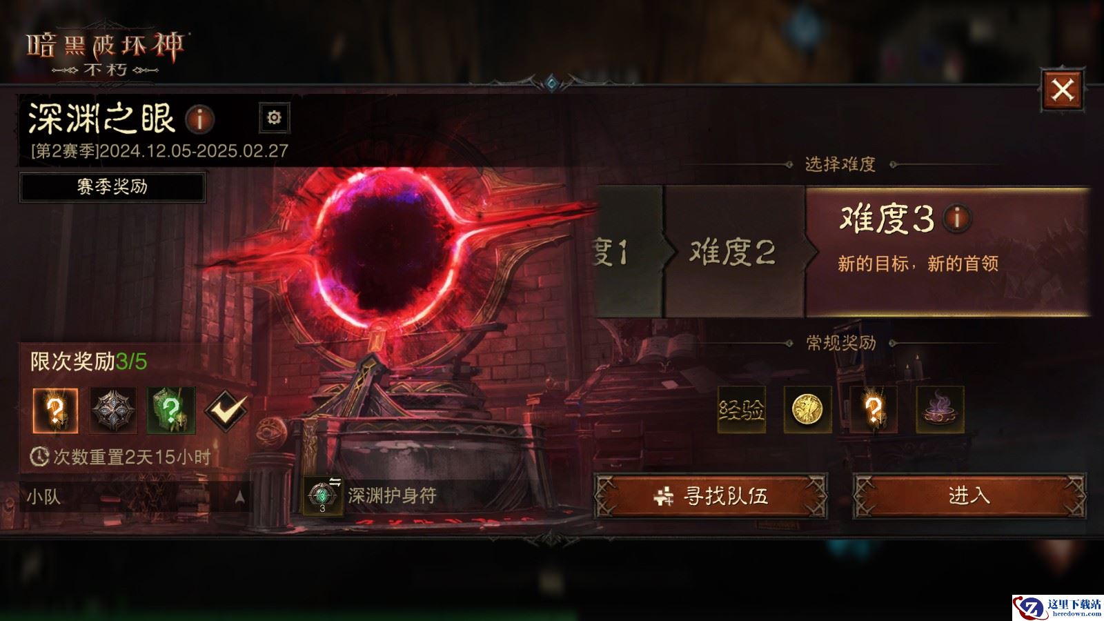 全新赛季,挑战升级!【深渊之眼】PVE玩法第2赛季现已全面开启,2024年12月5日至2025年2月27日,玩家参与该玩法后将进入全新副本关卡“灰烬峡谷”,在恶魔环伺之下,玩家需要通力合作护送攻城车摧毁各类恶魔防御工事,谋求胜利!【深渊之眼】玩法共分为4个难度等级,完成前置难度后方可解锁更高难度。在难度1和难度2中,玩家只要成功护送攻城车到达恶魔之心所在地,即可摧毁恶魔之心获得胜利。在难度3和难度4中,护送攻城车摧毁恶魔之心后,玩家还需要击败降临的魔神方可获得最终的胜利!当玩家通过难度4后,更能解锁梦魇难度,挑战自我!怪潮汹涌,勇者无畏,深入峡谷之中,用正义驱散黑暗的迷雾!