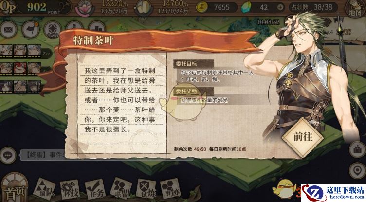 6、收集任务形式为帮xx收集一定数量的xx,这里我们以帮云轩收集烟草为例。烟草会随机出现在你的地块上,你需要派队伍到那个地块上收集(只需要跑路的时间),收集完毕后会刷新下一个烟草。内测时收集的上限是10,收集的越多奖励越高,可以提前交但是奖励会变少。收集并不需要接受任务的那队,所以可以让跑任务的在哪里等着然后让另一队在家里收集,收集完毕后让跑路队提交即可。因为开了沼泽以后地会很分散所以后期不建议接这个任务。