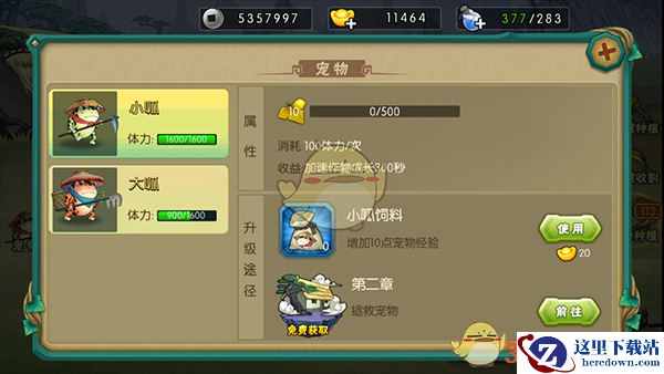 另外,还有可以帮助我们加快作物成熟的小宠物在~通关第二章组队副本副本即可获得第一个宠物小呱,部分组队副本掉落饲料、购买饲料喂养宠物即可升级,也可元宝直接购买。