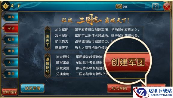 在三国志大陆中,初期军团没有城池的情况下,对所有军团随机分配到边城。且一个边城初始存在多个军团,刺激军团之间竞价攻占。竞价前两名军团进行战队,胜利者占领当前边城,战败军团可选择归顺中央军团。随着对城池占领数量的增多,中央军团将成为一个愈加庞大的战争机器。