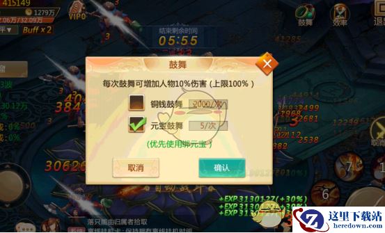 进入副本之后,副本中间会不断刷新怪物,右上角有鼓舞和效率的选项,其中鼓舞每次可以增加人物10%的伤害,最多鼓舞10次,前5次鼓舞消耗铜钱,后5次鼓舞消耗元宝(优先消耗绑定元宝);效率界面可以选择使用经验药水,升级经验又能进一步提升