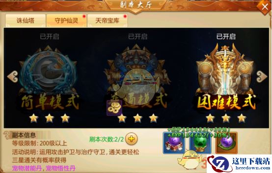 主要获得宠物经验丹、宠物进阶丹,如果3星通关的话还有可能产出宠物潜能丹和宠物悟性丹,一共有三种难度,当然,难度越高奖励也会越丰富,接下来就为大家介绍一下守护仙灵这个副本。