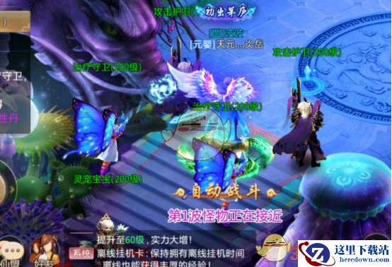 进入副本,人物出现在地图左下角,我们的目的就是守护住灵宠宝宝,可以充分利用攻击守卫(协助打怪)以及治疗守卫(加血)来提高我们打怪的效率。