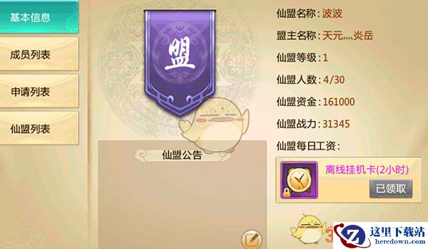 基本信息——显示仙盟名称、盟主名称、仙盟等级等信息,盟主可以进行设置仙盟公告、仙盟升级等操作,仙盟成员也可以在该页面领取仙盟每日工资,不要错过哦