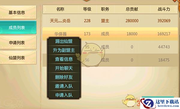 成员列表——显示当前仙盟内成员,可以快速查看盟友信息、聊天、组队等。盟主可以任命成员为副盟主,也可以将任意其他成员踢出仙盟,如果您有更换仙盟的打算,退出仙盟也是在这个界面进行操作