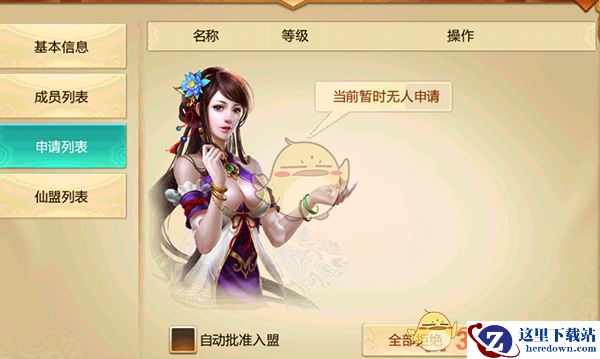 申请列表——显示当前申请入盟的玩家列表,如果勾选“自动批准入盟”,则无需批准,玩家点击申请即可进入仙盟