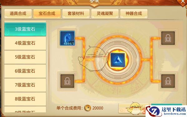 宝石合成需要消耗上一级的宝石以及部分铜钱,合成一个2级宝石则需要3个1级宝石以及10000铜钱的合成费用,依此类推,最终合成一个9级宝石则需要3个8级宝石和80000铜钱的合成费用。