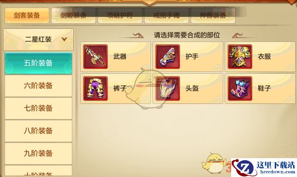 例如上图中,合成5阶红2星的武器,则需要3-5件本职业的5阶橙色2星装备来合成,可以不同部位但是必须要相同职业。