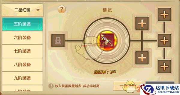 以5阶装备的合成为例,5阶红色2星装备的合成由3-5件5阶橙色2星的装备合成,其中3件合成成功率为70%,4件成功率为85%,5件成功率为100%。