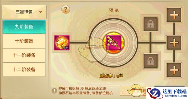 三星粉装的合成同样与之差别不大,神装由3件同职业红色三星装备加上一颗神源石来合成,合成成功率为100%