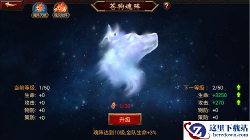 玩家在达到80级的时候,可以开启魂阵。培养魂阵可以提升武将属性。魂阵系统有多个魂阵,需要顺序激活,激活条件是前置魂阵达到指定等级。功能开启后自动激活第一个苍狗魂阵。