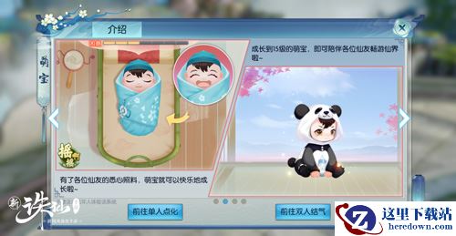 “萌宝系统”是此次新版本推出的全新社交模式,仙友们到达65级并满足相关前置条件后,即可体验“萌宝系统”带来的新鲜乐趣!
