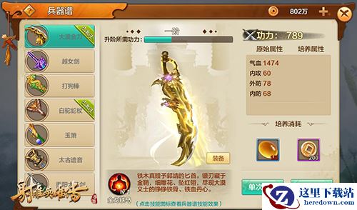 当然,这些神兵武器不只是好看而已,在游戏中,当各位大侠找到并激活这些江湖前辈所使用过的神兵后,将提升自身角色的各项属性。此外,这些神器还附带不同的被动技能效果,例如装配郭靖的大漠金刀后,各位大侠将获得金戈铁马技能效果,在攻击时会有10%的几率增加内功、外功攻击。