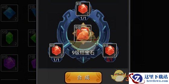 宝石共分为12个等级,最高等级为12级,3个同类型同等级的宝石可以合成1个更高级别的宝石,显而易见,要想获得1个九级红宝石,可以用3个八级红宝石合成(如图)。