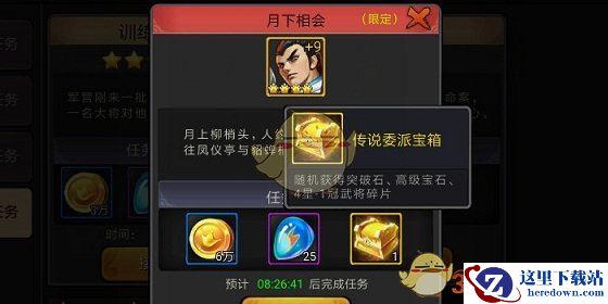 在委派任务中,由孙尚香、黄忠、夏侯惇、张飞、诸葛亮、貂蝉、马超、关羽、吕布和司马懿才可以单独完成的限定任务也可以获得相应等级的宝箱,有一定概率随机获得5级宝石。