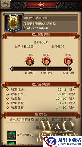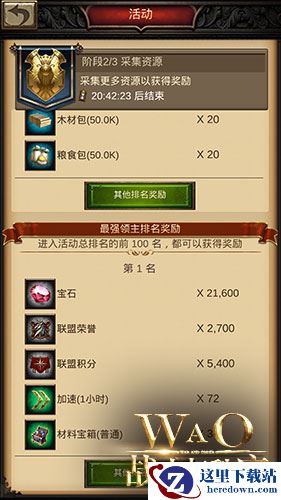 循环活动中,玩家可根据每一阶段在游戏中的行为来获得积分。当所得积分满足条件即时可通过邮件的方式领取奖励。奖励非常丰厚,有宝石礼包、VIP点数、资源包、联盟荣誉等,积分排名越高,获得的奖励越多。