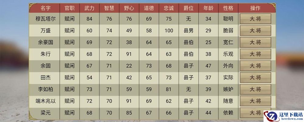 统御则会影响带兵数量。政治会辅助文官的建设。野心会影响反抗几率如果数值已经达到60以上则需要小心。