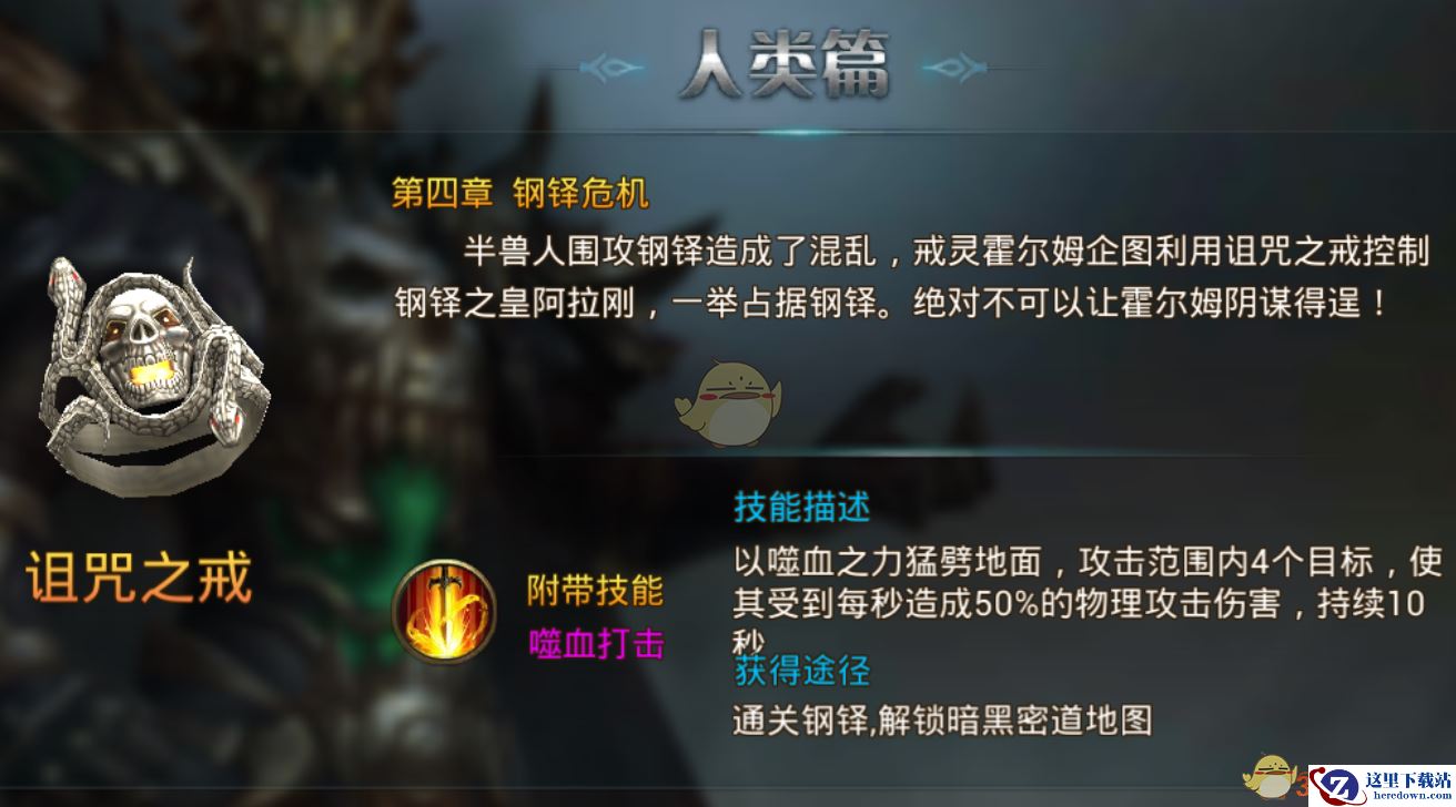 以噬血之力猛劈地面,攻击范围内四个目标,使其受到每秒造成50%的物理攻击伤害,持续10秒。