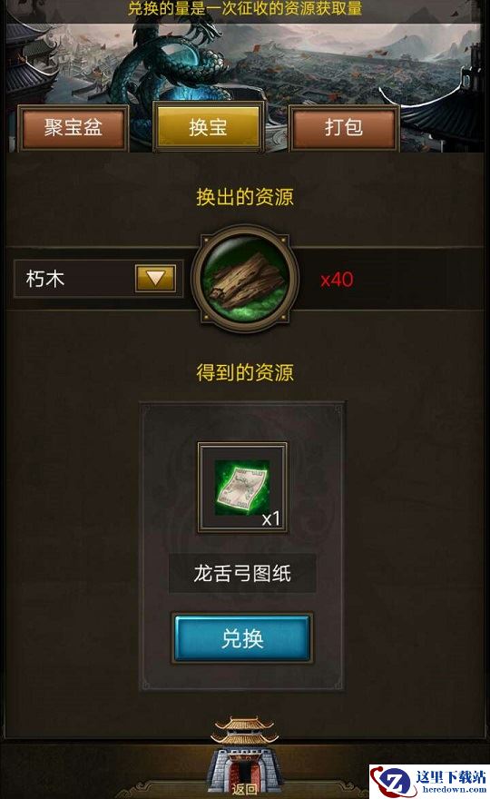 本次正统三国过关斩将版本里,将新增绿材料兑换功能。个人等级≥110级的玩家可开启绿材料兑换功能,主公们可将绿材料通过一定的数量比例兑换成龙舌弓图纸。