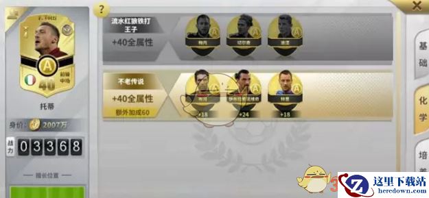 那么,在布冯、托蒂、特里、伊瓜因、伊布这几个球员当中,我们可以看见他们有各自不同的化学,必须取其最大公约数才符合我们的建队思路,所以,伊瓜因必须第一时间放弃,虽然他是一个不错的前锋,但是他的化学太分散,又是C罗又是梅西。然后,特里和伊布两个人之间要选择一个,这是一个分岔路,二选一没问题,无非就是不同的建队思路。