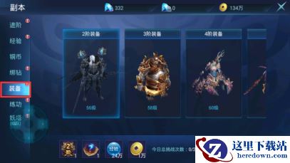 不想花钱又想要短时间提升战力值?来装备副本啊!装备副本每日默认挑战20次,一共8个关卡,通关后即可获得大量紫色外观装备,能直接装备在外观道具上噢,是角色属性提升的最好途径之一。奖励除了包括同阶级的外观紫色装备以外,还随机奖励进阶丹以及铜币奖励。