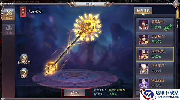 在神兵系统中点击幻化,选取已激活的神兵形象进行幻化操作,神兵形象会变为相应形象显示。