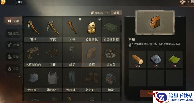 4、蜂箱,将花朵放在里面,可以制作成蜂蜜。(花朵地图采集获得)吃蜂蜜可以缓解头痛,不至于脑残而死。蜂箱四级解锁,制作材料如图。