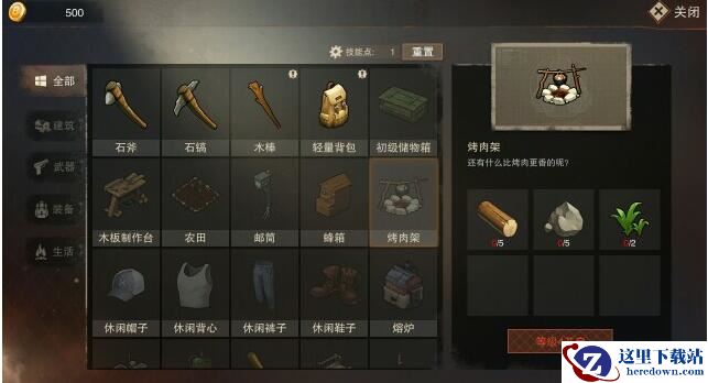 5、烤肉架,可以制作出食物,但是它需要燃料。也需要材料。(罐头通过烹饪可以制作成狗粮)烤肉架四级解锁,制作材料如图。