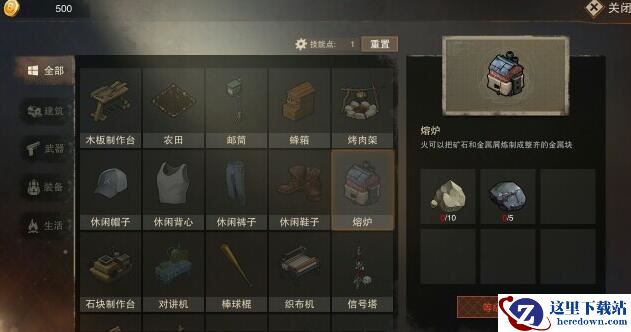 6、熔炉,制作金属材料但是他需要燃料。也需要矿石。八级解锁,制作材料如图。
