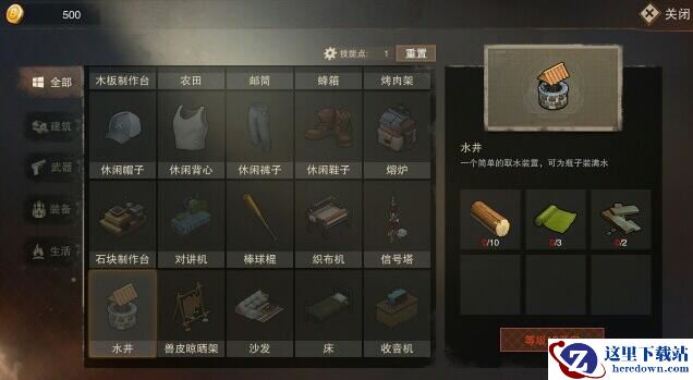 9、水井终于不会渴死了。可以用空水瓶装水。12级解锁,制作材料如图。