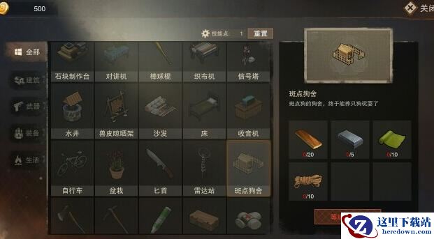 13、斑点狗舍(斑点狗官方获得,地图任务获得。)点击狗舍可以用狗粮喂养。增加食物度。就可以帮你一个小时刷新一件随机材料。(浪费食物度刷新,有几率刷新高级材料。)死亡时可以帮你随机捡起几件装备。但是也是浪费食物度的哟。(人都养不起了,又要养一条狗,难受。)