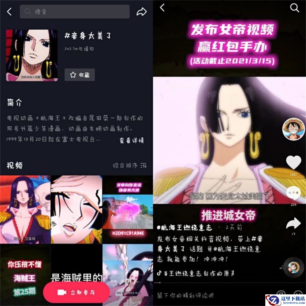 2月25日推进城女帝在《航海王:燃烧意志》手游中正式上线,它不仅引爆了玩家社区的讨论热度,也在抖音刮起了一阵“女帝风”。创作者@航海王燃烧意志 发起的#妾身太美了#话题在抖音刷屏了,此话题在首发第一天的播放量就超100w,两天后话题的播放量累计近350w! 其中,“妾身太美了”这一次话题词,正是引用了《海贼王》IP中“海贼女帝”汉库珂的经典台词“妾身无论做什么都会被原谅,因为妾身太美了。”