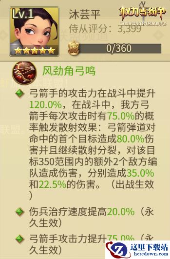 作为一个传说级别的侍从,能力又如此强大,领主们需要花费相当大的功夫,才能够将这位极其稀有的强力侍从收入麾下。和其他侍从一样,沐芸平也有她的拿手特技,因她极擅弓箭,因此她的天赋技能“风劲角弓鸣”对应的是弓箭手的能力,可以大幅加强弓箭手的攻击力。