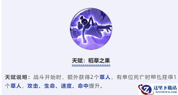 天赋说明:战斗开始时,额外获得2个草人,有单位死亡时额外获得1个草人,攻击、生命、速度、命中提升。