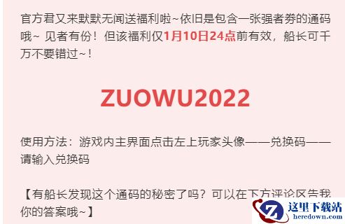 以上就是小编整理的关于《航海王:燃烧意志》1月11日礼包兑换码分享的全部内容,更多游戏攻略请持续关注手游网!