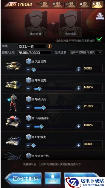 首先是稳健类配兵,以一个五万出征队列的队伍为例子,搭配装甲坦克4000,特种步兵1W6,攻坚战车8000,狙击兵1W2,主战坦克5000,轰炸机5000.这个搭配方法较为稳健,但是缺点是刷野效率会更慢,适合那种几次打都打不下来的野怪,或者玩家们在战力不足情况下,也就是战力不超过野怪情况下,想要越级刷野也可以试试。