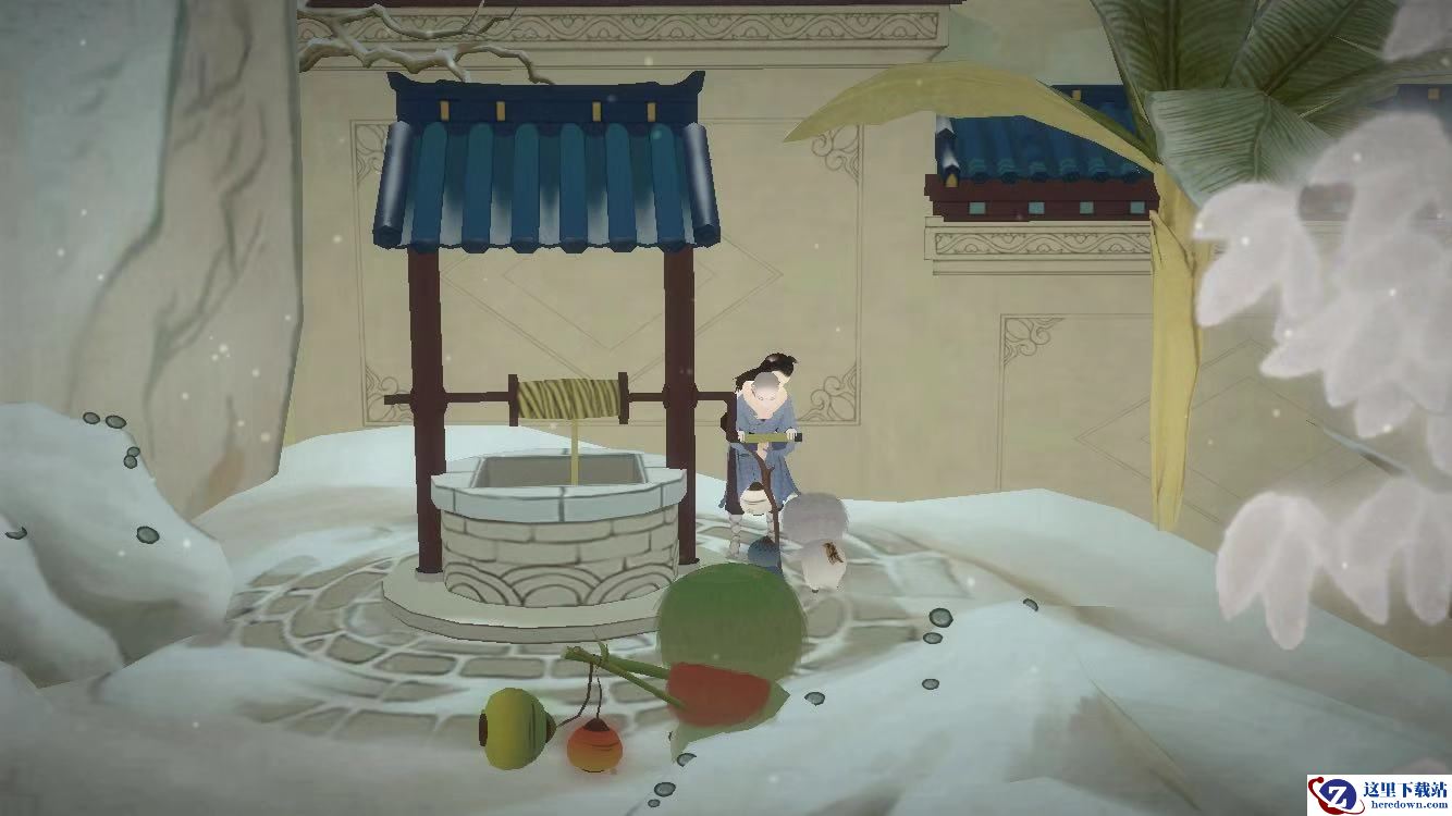第三幅画在这口井里,先用皎月精灵把井上面的雪化掉,再让一修转井绳。