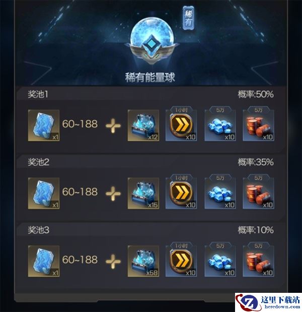 二、能量球分为普通能量球,稀有能量球,璀璨能量球,每种能量球里都有四种奖池,对应不同的奖励,开启能量球可获得四种奖池奖励之一(不同奖池奖励获 取概率不同,游戏内已公示概率),能量球等级越高开启能量球获得的奖励越丰厚哦。
