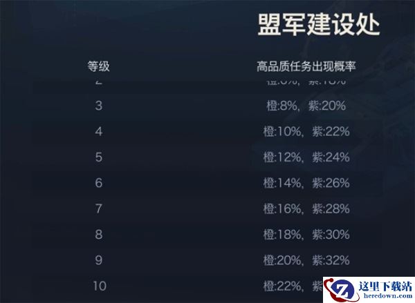 随着盟军建设处等级的提高,高品质任务出现的概率随之增加,当盟军建设处达到10级的时候,橙色任务出现概率为22%,紫色任务出现概率为34%。
