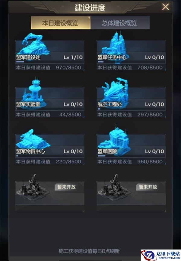 二、每个建筑通过施工任务获得的建设值有每日上限,各建筑每日建设值上限可点击建设进度按钮查看。